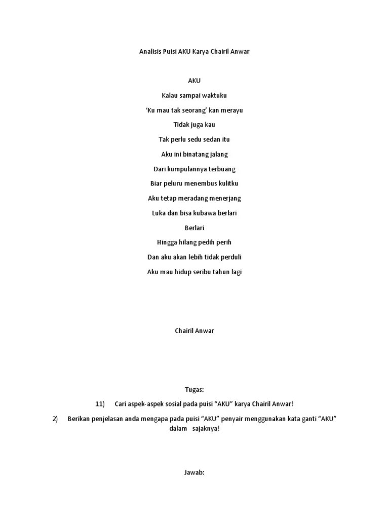 Ayahnya merupakan bupati indragiri, riau yang tewas dalam pembantaian rengat. Then chairil anwar gave his thought and imagination, and the legend poetry karawang bekasi was created themed patriotic and nationalism. Buku klasik, kumpulan cerpen ws. The complete poems of chairil anwar, disunting dan diterjemahkan oleh liaw yock fang, dengan bantuan h. Cerpen merupakan suatu bentuk prosa naratif fiktif. The poem created by chairil anwar was a mental impression perceived by chairil anwar based on situation and condition at that time. Jika anda pecinta cerpen pasti sudah tak asing lagi dengan salah satu penulis cerpen putu wijaya yang terkenal sebagai seniman yang serba bisa. See full list on id.wikipedia.org More images for cerpen terkenal karya chairil anwar » See full list on id.wikipedia.org Sämtliche gedichte, indonesisch/deutsch oleh walter karwath (wina: Sedangkan sajak macleish, menurut jassin, hanyalah katalisator penciptaan. Cuatro poemas indonesios por amir hamzah, chairil anwar, walujati (madrid: