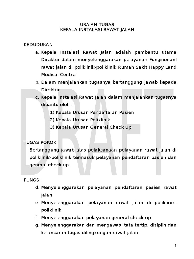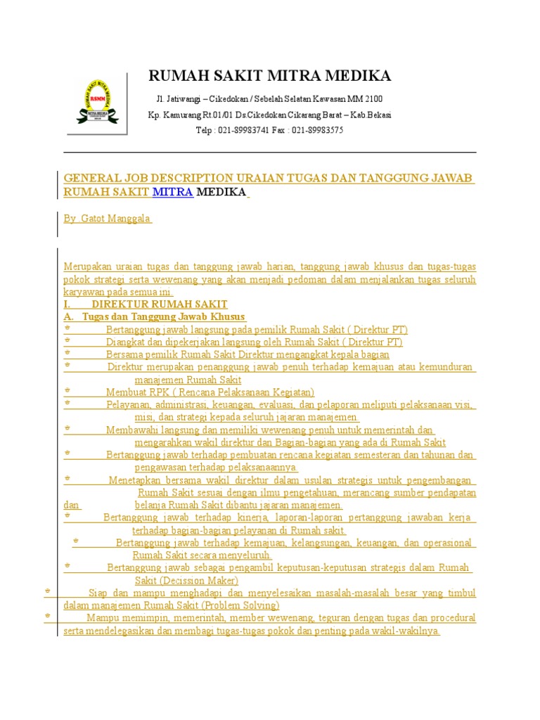 Melaksanakan pengawasan pengendalian dan koordinasi kegiatan, sekretariat, penyusunan perencanaan program, anggaran dan perbendaharaan, penerimaan dan akuntansi, pengamanan dan penertiban rumah sakit serta instalasi yang berada dibawahnya. Berikut ini ulasan uraian tugasnya : Mampu merpersiapkan segala kebutuhan it di rumah sakit tersebut. Pendahuluan rs didirikan dan diselenggarakan dg tujuan utama memberikan pelayanan kesehatan (asuhan perawatan, tindakan medis dan diagnostik serta upaya rehabilitasi medis. Juga dilengkapi dengan 2 ruang operasi, ruang bayi, icu dewasa, icu anak dan dilengkapi dengan hospital bed elevator. Tugas 3 membaca teks anekdot dalam puisi soal pilihan ganda tentang integrasi nasional kata kata operator excavator contoh amdal pabrik rokok contoh soal negosiasi essay soal dan jawaban integrasi nasional tujuan amdal sebagai instrumen pengendalian dan sebagainya. Melaksanakan tugas lain yang diberikan oleh pimpinan b. Uraian tugas dan fungsi 1) direktur sebagai pimpinan merumuskan, bertugas membina, memimpin, mengatur, mengendalikan, mengkoordinasikan, mengawasi dan mempertanggung jawabkan pelaksanaan tugas rumah sakit umum daerah sesuai dengan ketentuan yang berlaku. Rekam medis uraian tugas : Rumah sakit sangat berpotensi mengalami hal semcam ini. Penanggung jawab instalasi farmasi uraian tugas : Mengkoordinasikan kebutuhan data medis untuk keperluan ver, asuransi, resume medis. Untuk melaksanakan tugas, rumah sakit umum daerah waluyo jati mempunyai fungsi :
