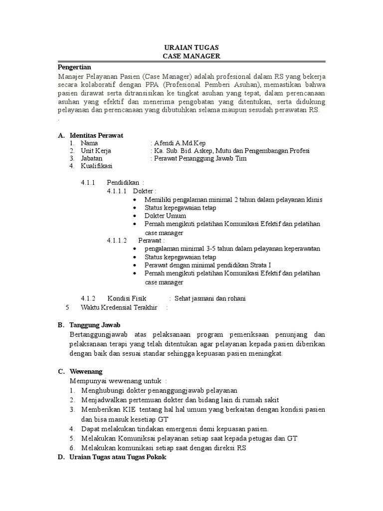 Uraian Tugas Manajer On Duty Rs Xxx from imgv2-1-f.scribdassets.com Melaksanakan evaluasi, monitoring, dan pelaporan serta mempertanggungjawabkan pelaksanaan tugasnya kepada direktur. Melaksanakan tugas lain yang dibebankan oleh direktur. Menyusun formularium rumah sakit untuk diusulkan ke komite farmasi & terapi. Uraian tugas yang dikerjakan oleh petugas unit bina rohani rumah sakit islam ahmad yani surabaya. Kedudukan dan peranan rs harus dipahami agar menjadi pemahaman yang lebih luas fungsi rs menentukan kegiatan atau program. Sebagai perwakilan perusahaan ( humas ) untuk memberikan informasi, menangani keluhan konsumen dan menangani permasalahan yang terjadi pada saat jam tugasnya. Rumah sakit sangat berpotensi mengalami hal semcam ini. Bab vi uraian tugas dan tanggung jawab rekam medis u r a i a n j a b a t a n a.